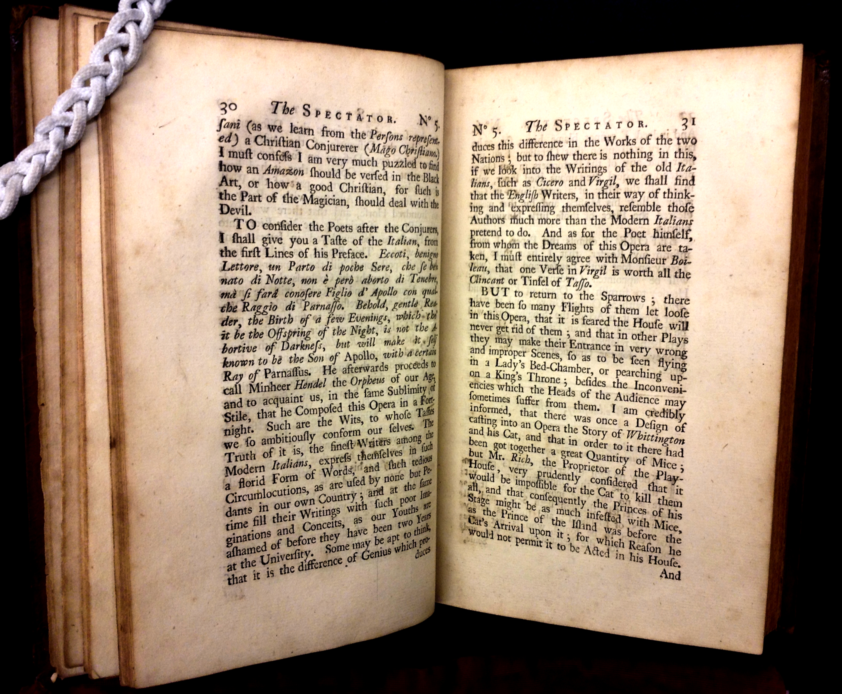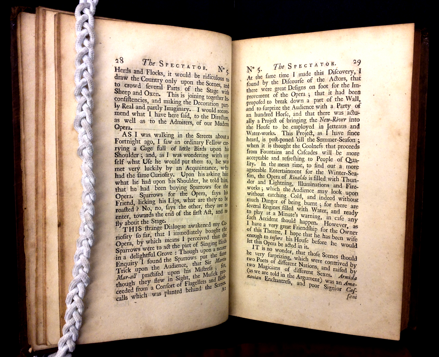 The Spectator’s essays on Italian opera ridiculed key elements of the entertainment, but specifically its foreign language and opulent staging. In several of these essays, including Essay No. 5 shown above, The Spectator focuses on George Frederic Handel’s Rinaldo, a highly successful Italian-style opera which debuted in London shortly before the launch of the The Spectator in 1711. The following excerpt illustrates what Mr. Spectator was attacking both specifically and generally — in this case, the absurdity of mixing of “Shadows and Realities” by incorporating actual birds into the production.